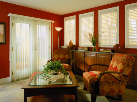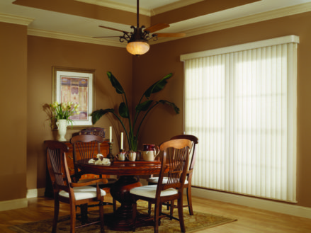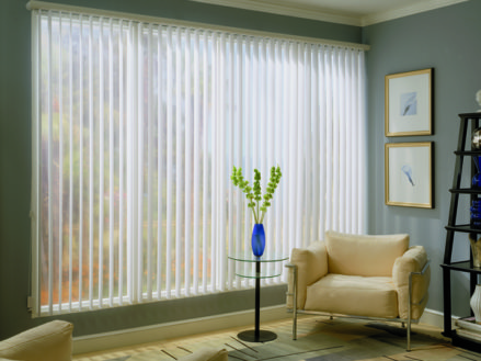 Vertical Blinds are manufactured with a series of 3 1/2” wide vertical louvers that traverse along a headrail and are typically controlled by a wand or cords that traverse and rotate the louvers. They offer one of the most economical ways to cover large areas of glass and can often be found in commercial applications as well as in residential buildings. The louvers can be rotated at different angles to control light and privacy; and because the louvers are traversed rather than raised, these Blinds work very well on sliding glass doors because the blinds mimic the movement of the door.